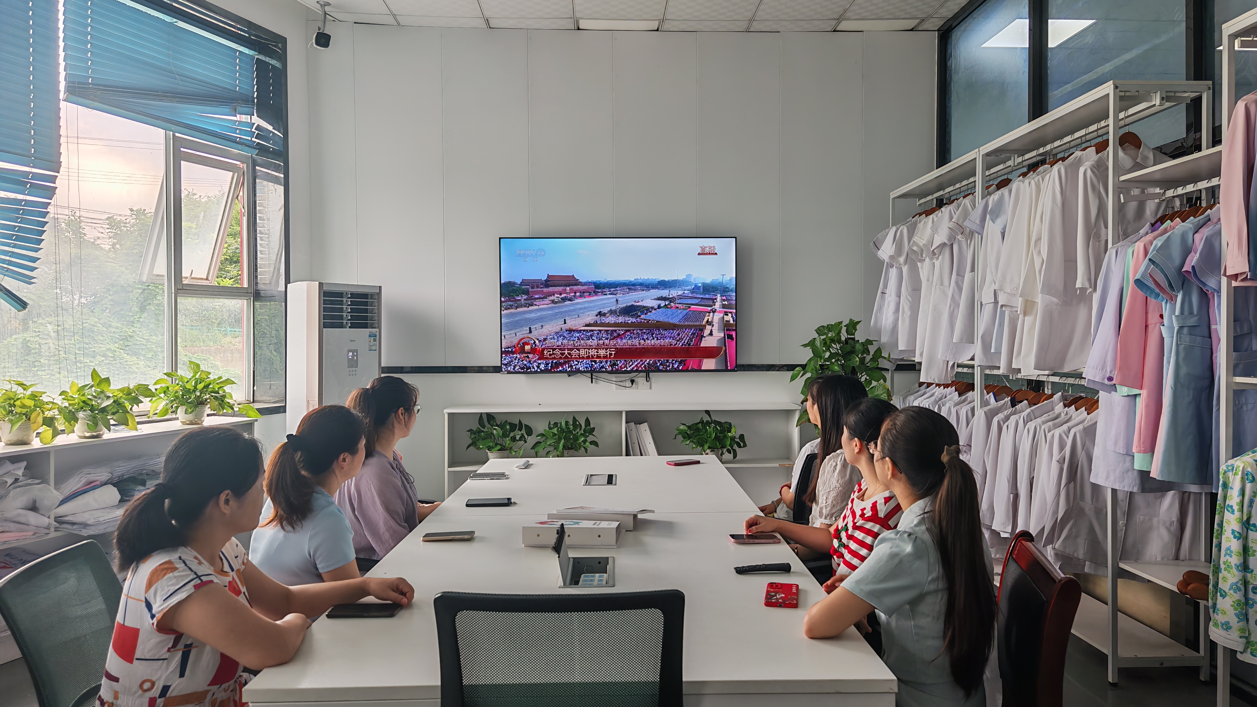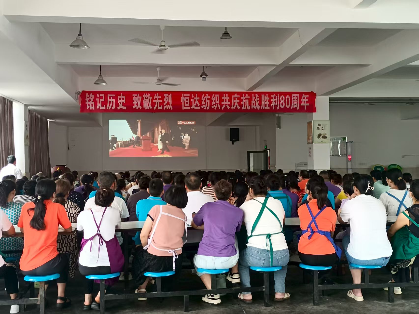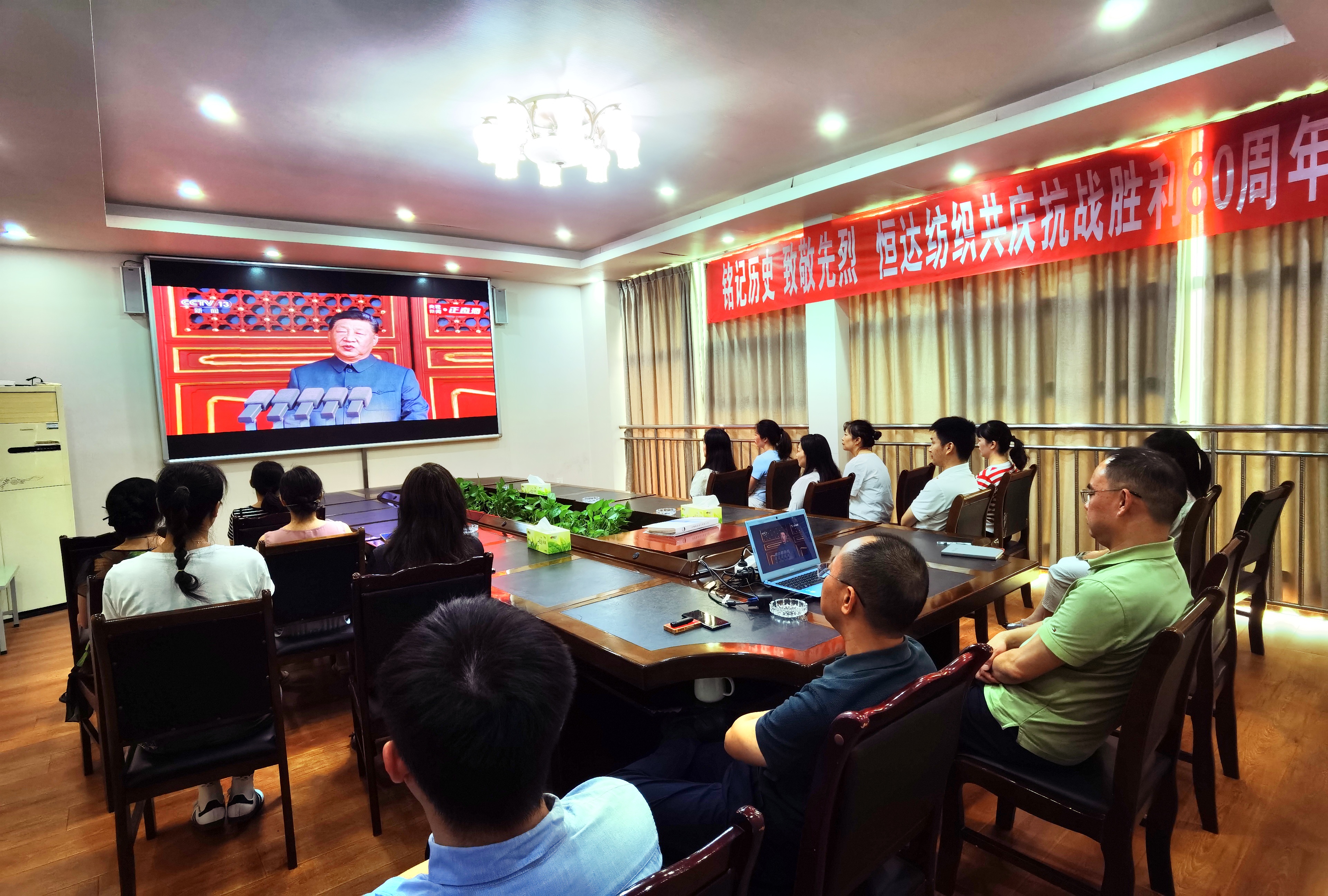 为了铭记历史、缅怀先烈,激发全体员工的爱国热情与民族自豪感,恒达纺织精心组织了全体员工集中收看此次阅兵直播。公司分别在二楼大会议室、食堂区域设置了集中观看点,其他员工也在各自办公室一同见证这一历史时刻。